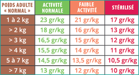 Servez à votre animal en un ou plusieurs repas par jour selon les quantités indiquées ci-après en fonction de son poids et de son activité.