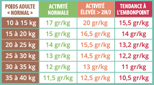 Ces quantités sont indicatives et correspondent aux besoins métaboliques d’un chien taille moyenne.